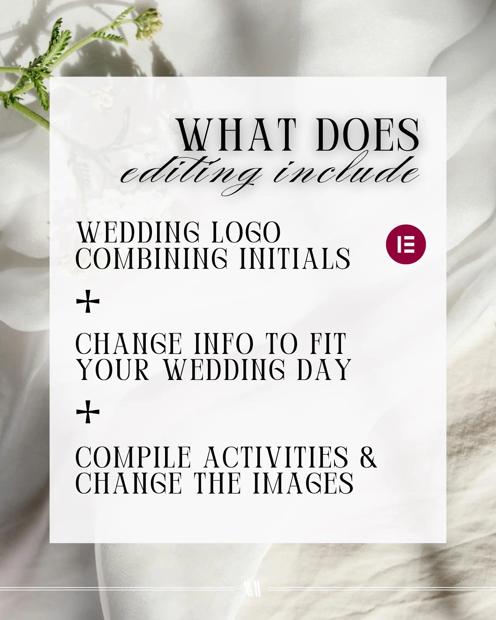 Done-for-You Setup & Editing Service: We handle it all — from building your initials wedding logo, to updating your date, venue, and dress code, to uploading your favorite photos.
